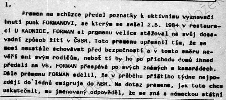 Začátkem května 1984 seděl Oto Klempíř s Petrem Formanem v restauraci U radnice. Druhý den šel StB oznámit, o čem si povídali: „Forman si velice stěžoval na svůj způsob žití v ČSSR,“ píše se ve svazku StB. Klempíř estébákům sděluje, že se Forman musí neustále schovávat před bezpečností a nevěří ani svým rodičům: „Neboť ti by ho po příchodu domů ihned předali VB,“ píše se ve svazku. Přespává prý raději u známých. Estébák si napsal do svazku důležitou poznámku vycházející z udání Oto Klempíře: „Pramenu sdělil, že v průběhu příštího týdne, nejpozději do čtrnácti dnů emigruje do NSR.“