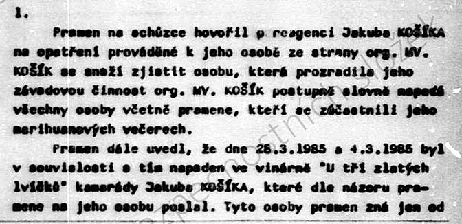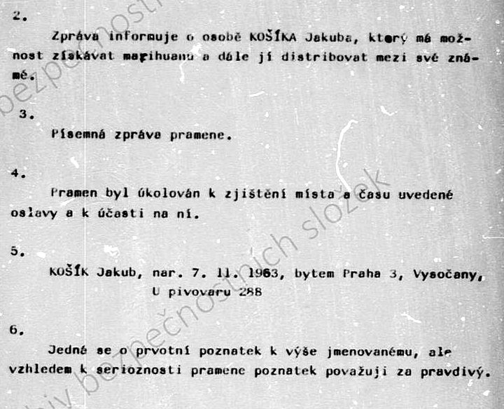 Krátce nato StB založila Jakubu Košíkovi svazek prověřované osoby s krycím jménem „Koš“. Poručík Petr Kunc zapsal, že cílem bude především prověřit „podíl Košíka na propagaci a distribuci omamných látek“.