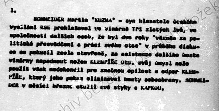 Jakub Košík StB udává, že Oto Klempíře napadl ve vinárně Martin Schneider, syn redaktora RFE.
