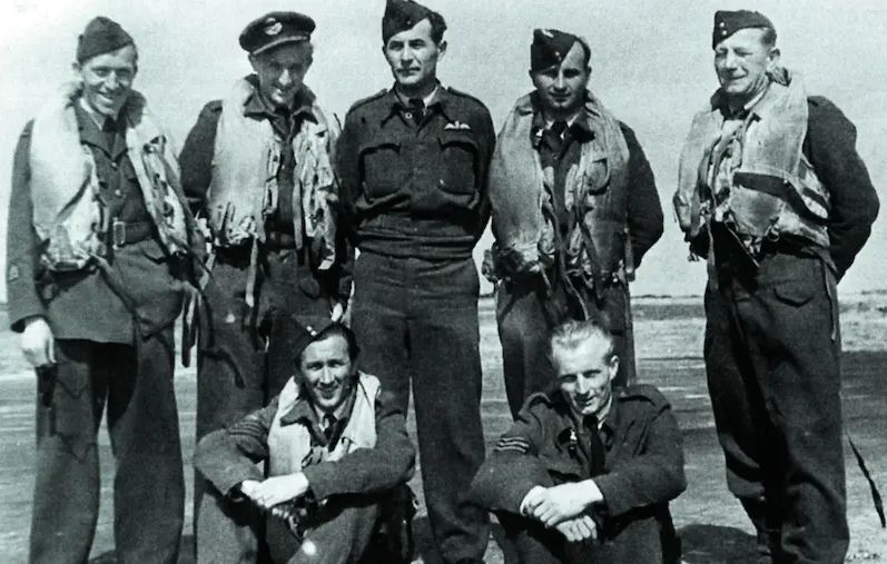 Josef Balejka a Jaroslav Novák (oba vedle sebe úplně vlevo) s posádkou Liberatoru u 311. čs. perutě