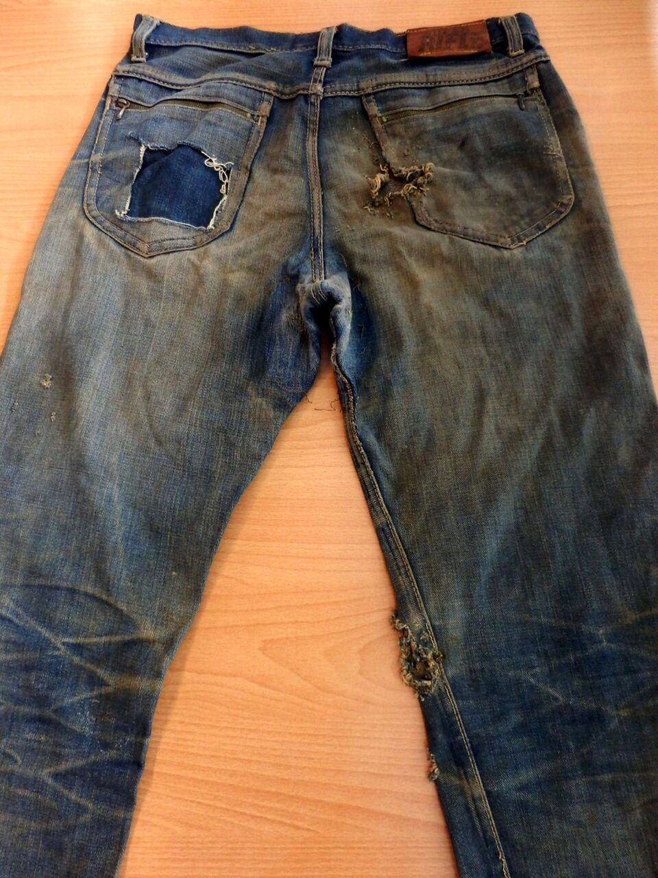 Prostřelené džíny Petra Šídy z 21. 8. 1968 (pravá kapsa, kterou vycházela kulka a úlomky kostí ven - průstřel pánve)