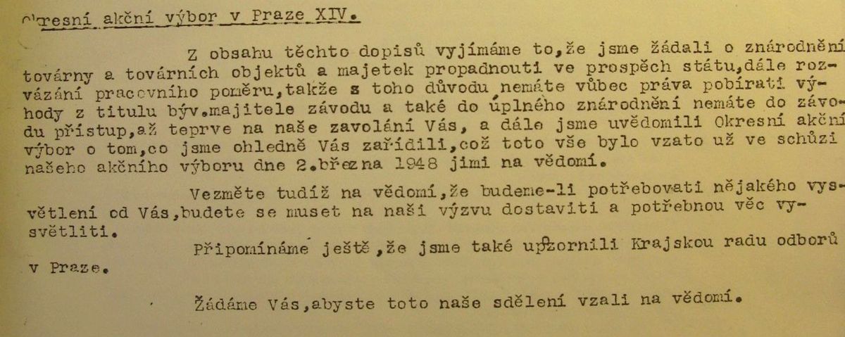 Už ve středu 25. února se v továrně v Michli ustavil akční výbor. „V sobotu přišla za otcem závodní rada a řekla: ,Pane šéf, v pondělí už nechoďte.‘“ K 8. březnu pak František Lhotský starší obdržel sdělení akčního výboru, v němž se mu strohým jazykem sděluje, že nemá v továrně již žádná práva, ale musí být akčnímu výboru na vyzvání plně k dispozici.