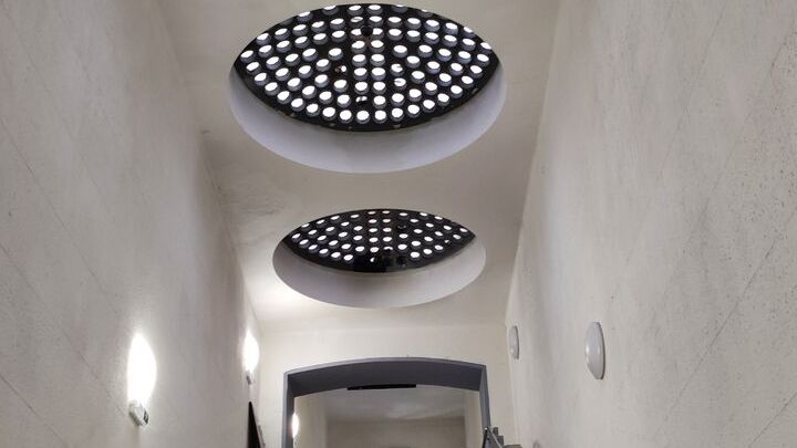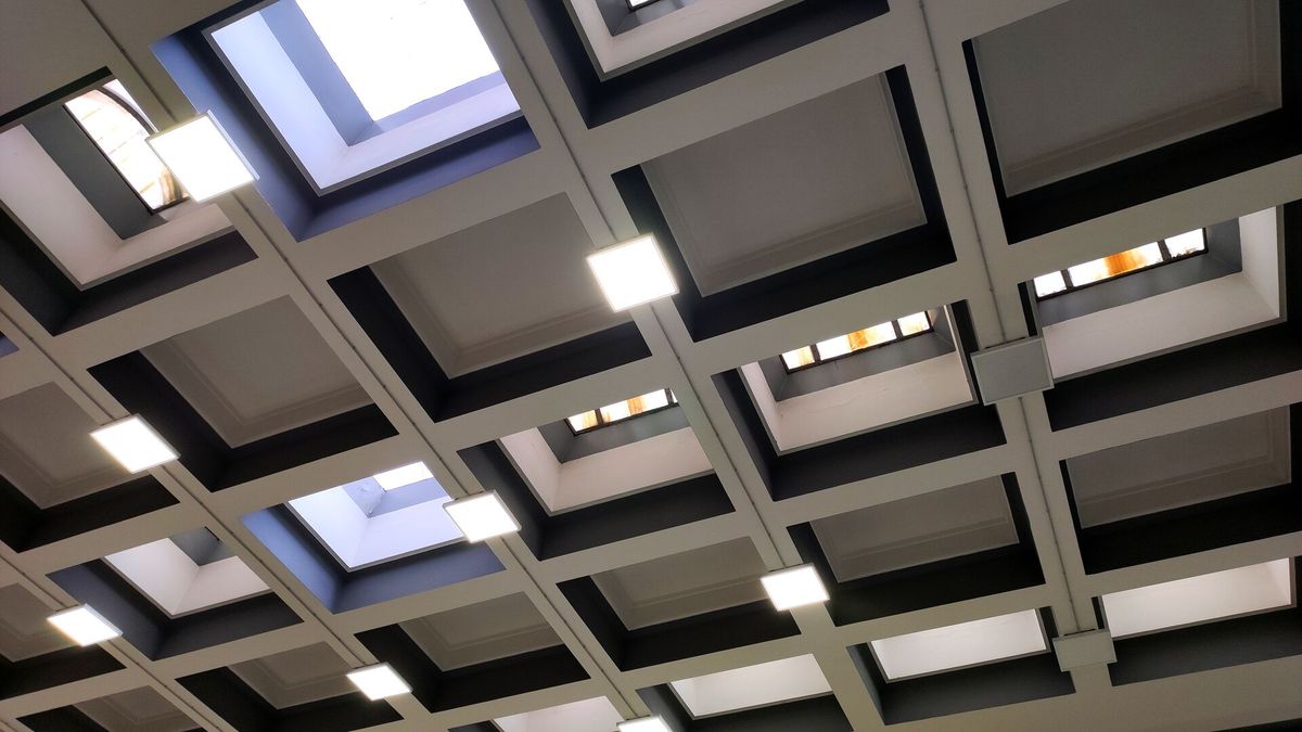 Střecha zimní zahrady, která nahradila původní kulatou střechu při přestavbě na menzu.