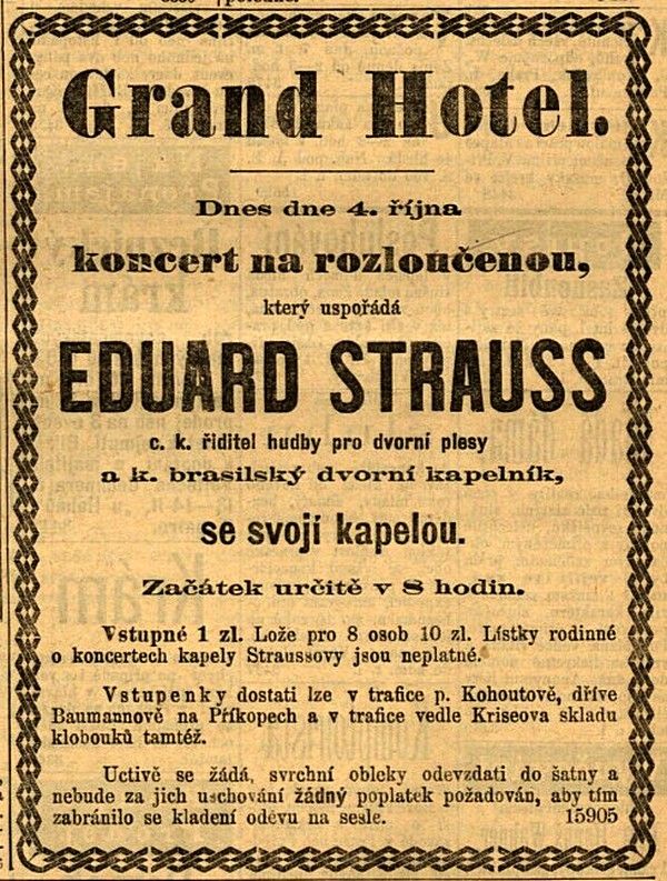 Situaci nezachránil ani fakt, že v sále hotelové zimní zahrady vystoupil syn vídeňského krále valčíků Eduard Strauss, zvaný Krásný Edi. Německé noviny ho žádaly, aby hotel hned opustil, má-li jen trošičku národního citu. „České publikum se bez Strausse obejde, protože obecenstvo pražské není přítelem tatrmanství před pultem kapelníkovým a piruety páně Straussovy snadno oželí,“ odpověděly kousavě české Národní listy.