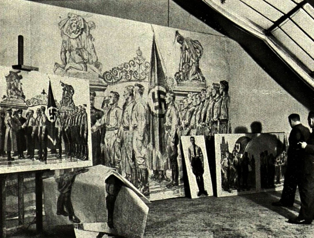 Návrhy německých studentů pražské Akademie výtvarných umění pro nástěnnou malbu v Langemarckhausu, jak se za války Německý studentský dům nazýval.