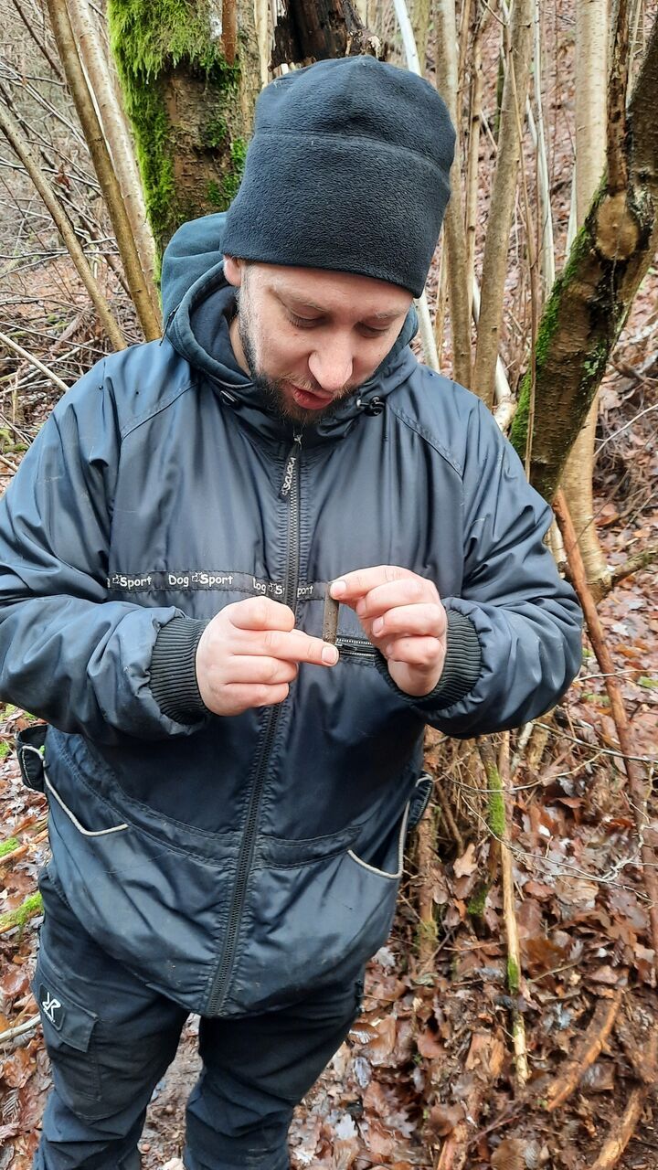 Detektor kovů pípá co chvíli. Nejprve zvyšuje svůj „tep“ kvůli železitému kameni, následně kvůli úlomku z lesního traktoru, ale už po několika minutách archeolog ze změti hlíny a listí tahá zablácenou nábojnici. Policisté obratem kamsi posílají fotku zkorodovaného žlutého předmětu, během telefonátu jej pak přeměřují a hlásí, že pochází z válečné munice Mauser 57 mm. „Já snad ještě začnu dělat archeologii,“ glosuje úspěch Netolický ve zjevné narážce na svoje školské působiště, přednášky a semináře, které vyplňují většinu jeho času.