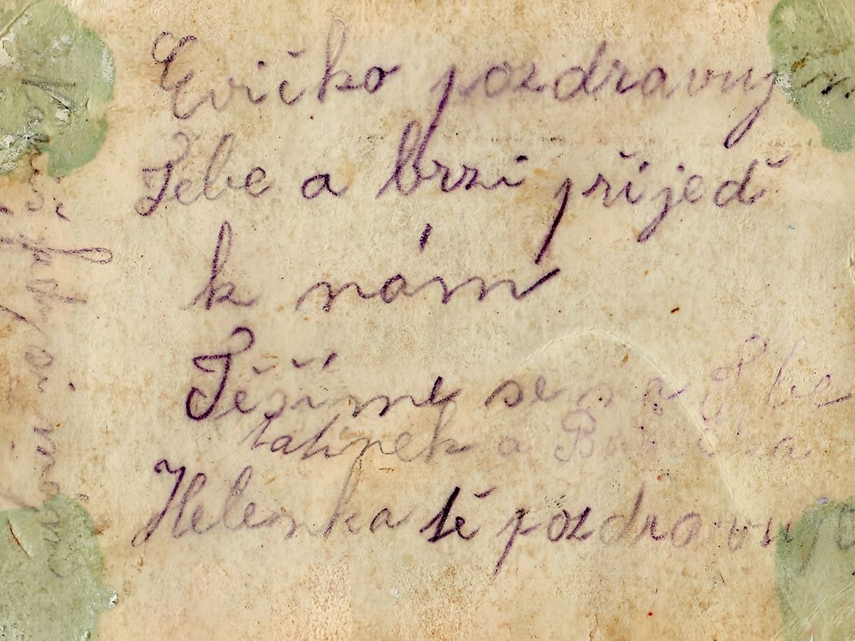 Vzkaz na zadní straně fotografie, kterou poslali Michalcovi Evičce Demelové do Hagiboru