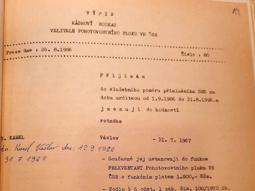 Stejně dobře jako na své kamarády Václav Karel působil i na režimní policii. „Již odmalička jsem měl rád uniformu a věřím, že se v budoucím kolektivu dobře zapojím,“ napsal si do životopisu, jímž v lednu 1986 doprovodil svou přihlášku. Aparátu se líbil. „Jako člen SSM, ROH, ČSTV a SČSP [Socialistický svaz mládeže, Revoluční odborové hnutí, Československý svaz tělesné výchovy, Svaz československo-sovětského přátelství, pozn. red.] se plně angažuje pro politiku KSČ,“ přiznal uchazeči starší referent II. oddělení Kontrolního oddílu Krajské správy SNB v Litoměřicích mjr. Stanislav Suchý. „Po morální stránce se jedná o klidného a upřímného soudruha se smyslem pro povinnost,“ chválil Karla v hodnocení už po prvních měsících služby vedoucí jeho oddílu.